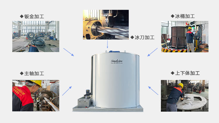 片冰機蒸發(fā)器作為片冰機蒸發(fā)產(chǎn)冰的組件,是機器產(chǎn)能及產(chǎn)冰質(zhì)量最重要的部件。森德制冰具備多年的片冰機設(shè)計和生產(chǎn)制造經(jīng)驗,根據(jù)客戶的用冰需求,我工廠可單獨代工蒸發(fā)器單桶??蛻艨善ヅ渥杂械闹评錂C組,進行安裝調(diào)試,滿足生產(chǎn)需求。
